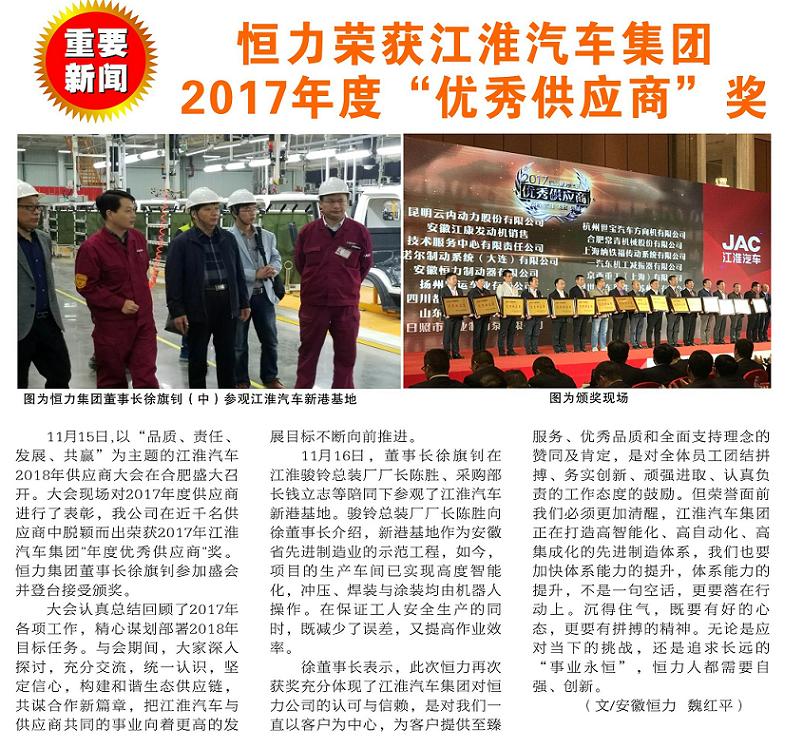 恒力榮獲江淮汽車集團(tuán)2017年度“優(yōu)秀供應(yīng)商”獎(jiǎng)